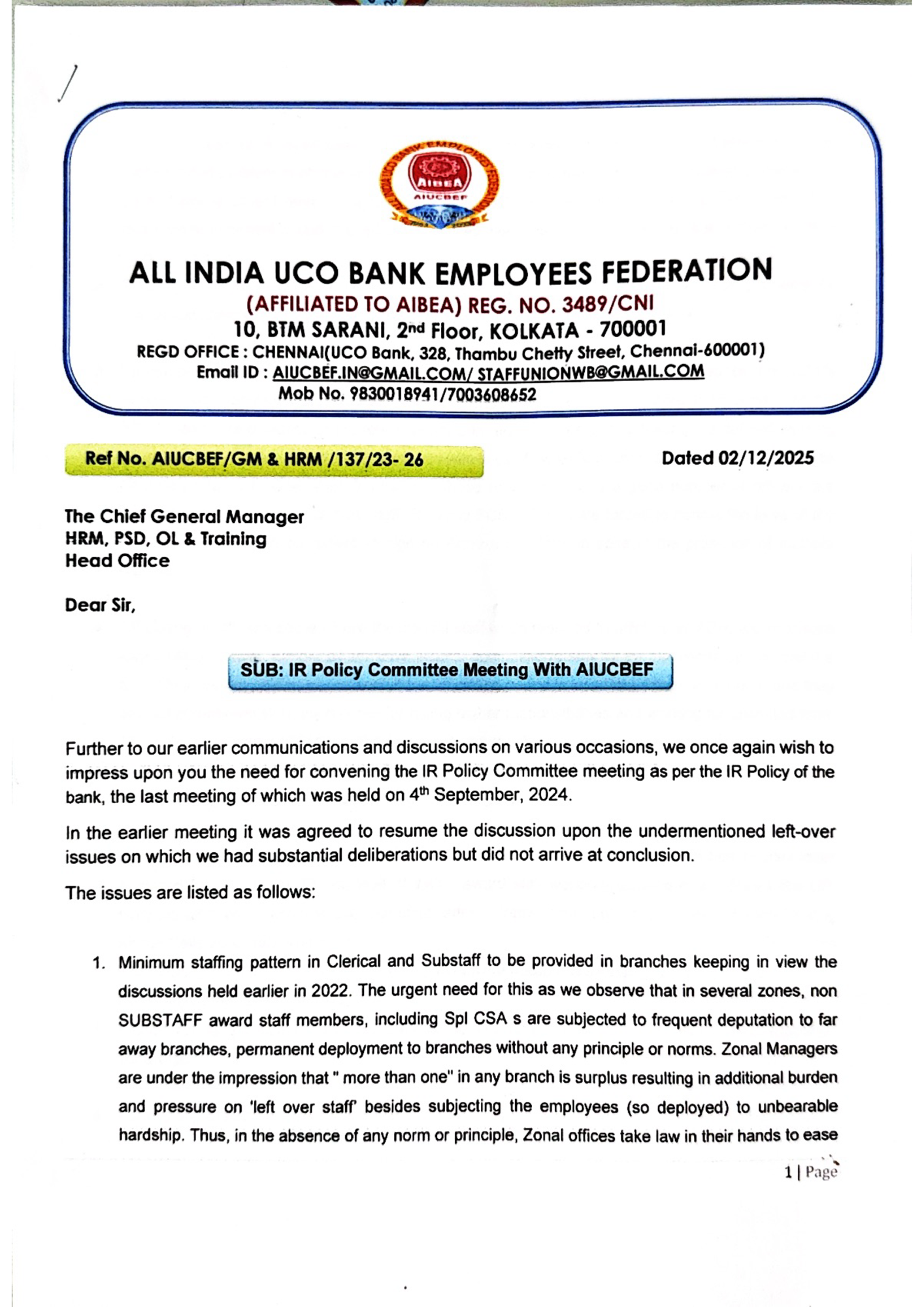 We invite reference to our previous communication (AIUCBEF/ MD & CEO /112/ 2023-2026 dated 03.06.2025) on the captioned subject. We sincerely appreciate our bank’s initiative as in March, 2023, conveyance…